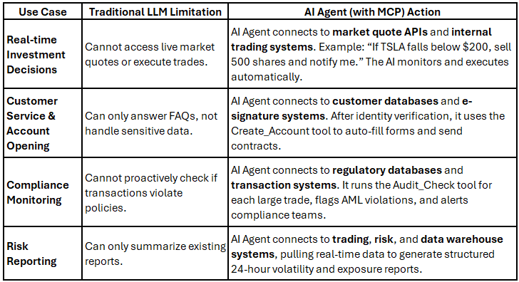 The finance sector relies heavily on real-time data, regulatory compliance, and precise execution—areas where traditional LLMs fall short. MCP bridges this gap.