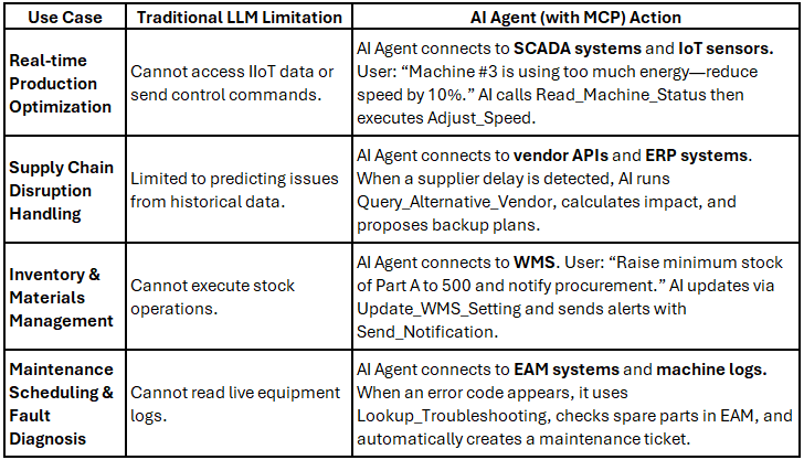 Manufacturing demands real-time control of production lines, inventory, and logistics. MCP allows AI to directly interface with Operational Technology (OT) and supply-chain software.
