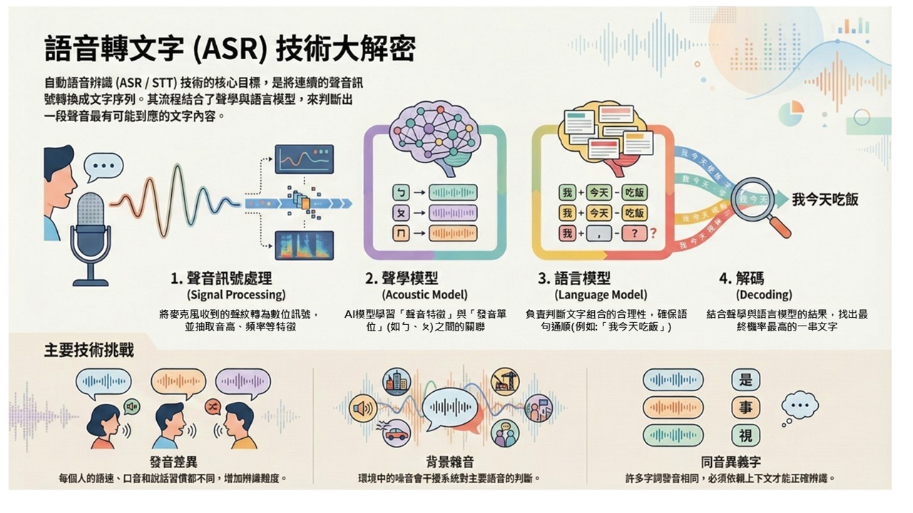 自動語音識別(ASR,Automatic Speech Recognition),又稱語音轉文字(STT,Speech-to-Text)讓電腦能「聽懂」人類語音並轉換為文字。其核心原理是運用先進的演算法和機器學習模型分析聲音訊號,識別語音特徵對應的文字。隨著深度學習的突破,現代語音識別的準確率大幅提升,甚至能理解不同口音和方言,在嘈雜環境下仍保持良好表現。這項技術成為人機溝通的關鍵橋樑,廣泛應用於智慧助理、語音輸入、客服系統等領域,正迅速改變我們的生活與商業模式。